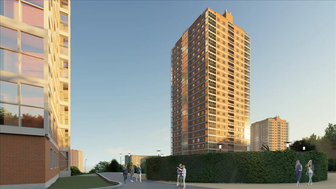 Проектом предусмотрен навесной вентилируемый фасад с облицовочным кирпичем и панорамным остеклением лоджий.