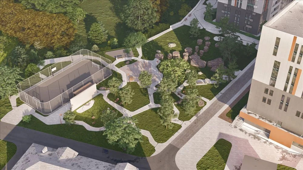 В комплексе также создана большая спортивная зона с многофункциональной площадкой, которую можно использовать для игр в футбол, стритбол, а зимой хоккей и катания на коньках.