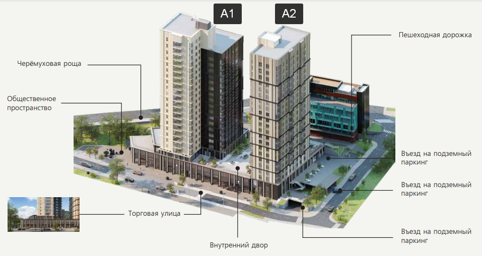 Двор без машин здесь выступает в качестве центра притяжения, становясь зеленым оазисом спокойствия и безмятежности в бесконечной суете мегаполиса.