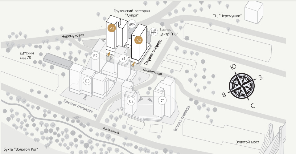На земельном участке, площадью 1,82 га запланировано строительство семи корпусов в три этапа. Здания квартала спроектированы таким образом, чтобы из квартир открывался неповторимый вид на бухту Золотой Рог и город, а расположение домов и растояние между ними позволяло солнечному свету проникать во двор и окна в течение всего дня.