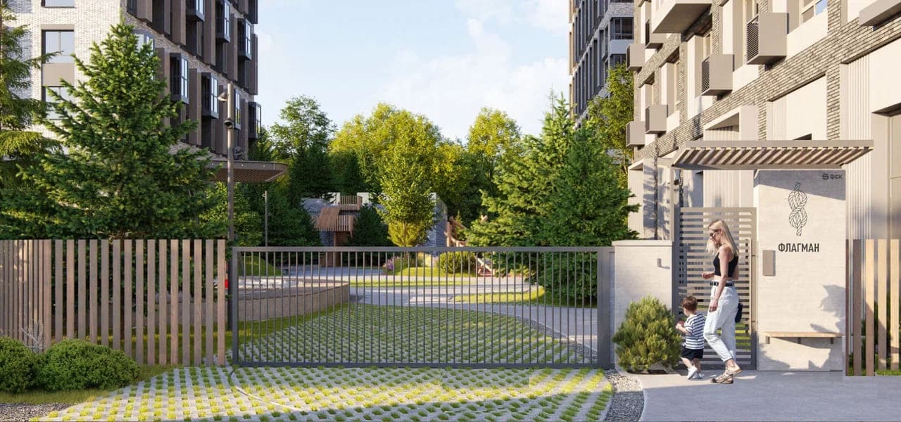 Двор без машин - уединенная обстановка территории комплекса выполнена в формате закрытого типа и огорожена со всех сторон, что исключает вероятность появления во дворе постороннего лиц. Доступ на придомовую территорию возвожен только с помощью RFID-ключа.