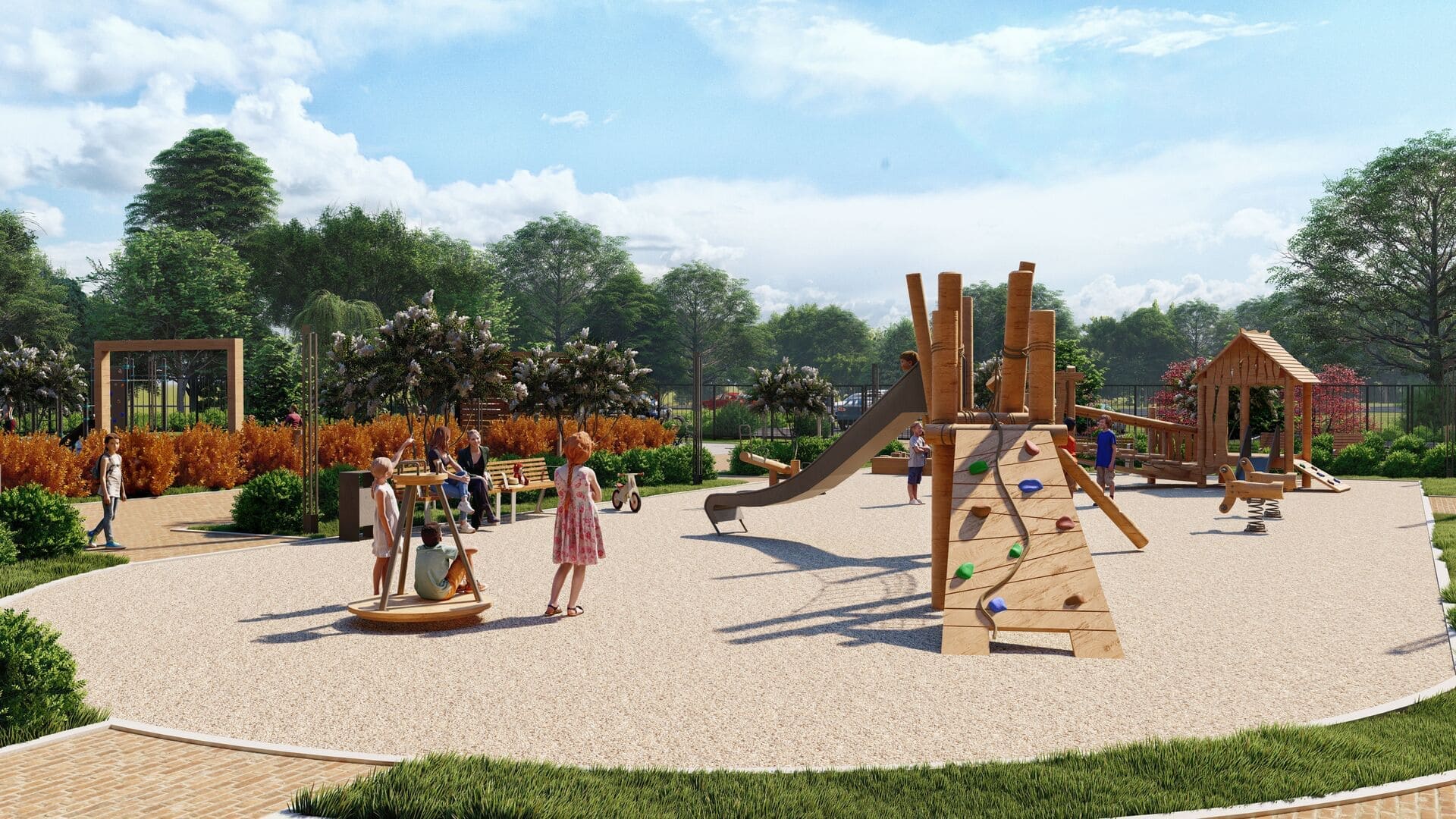 Детские площадки для детей разных возрастов, оснащенные безопасным игровым оборуданием, выполнены из натуральных материалов.