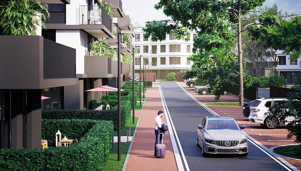 Пешеходные дорожки для прогулок по внутренней территории и внешнему периметру проекта.