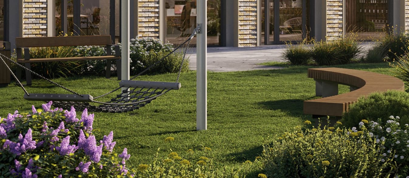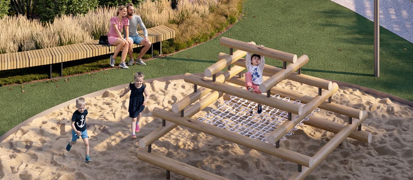 Детские площадки с современнным игровым оборудованием для детей разных возрастов и местами отдыха для родителей.