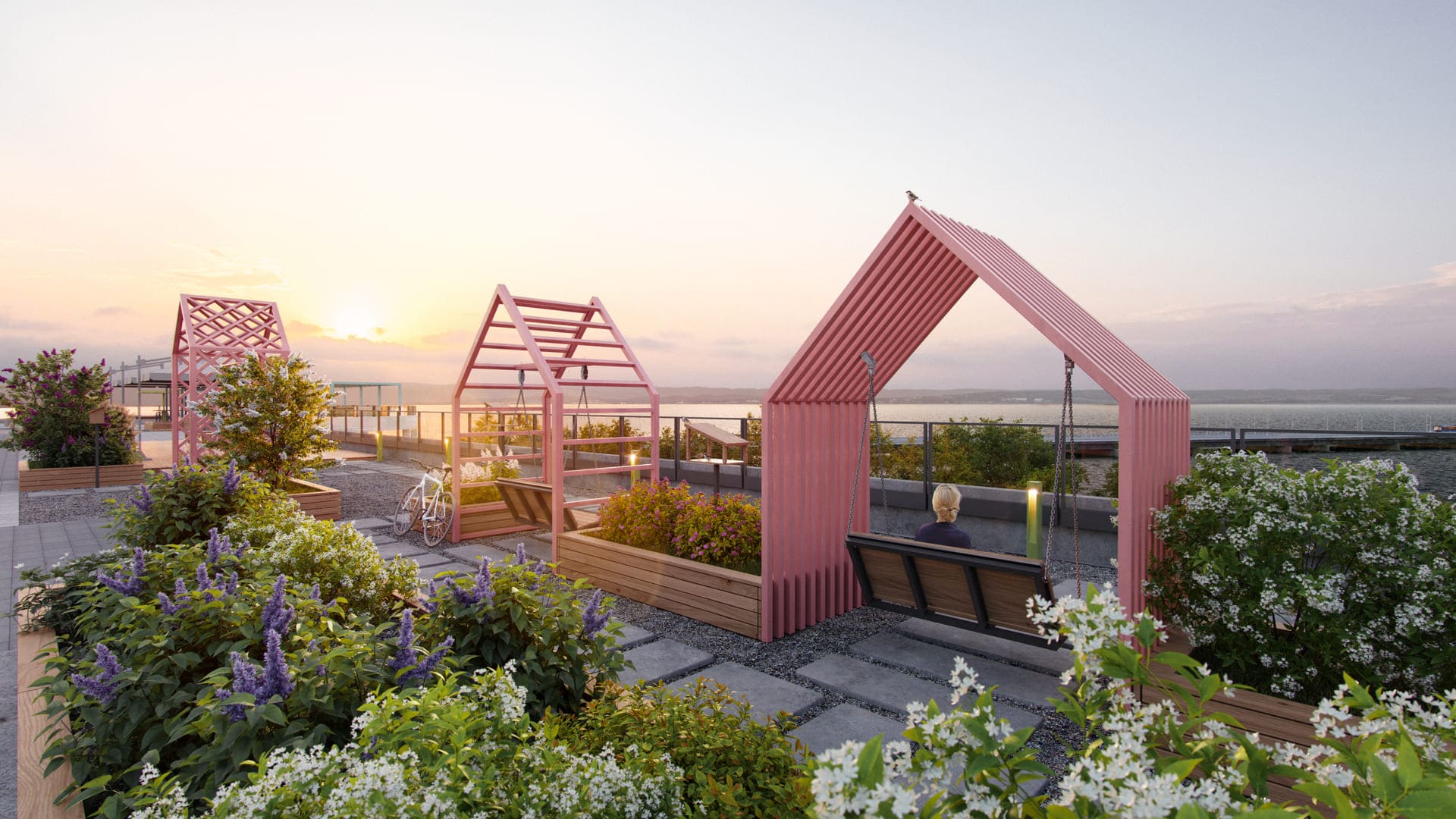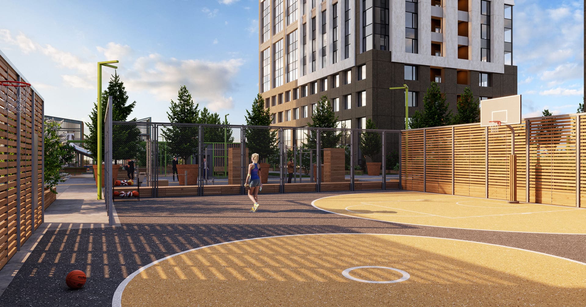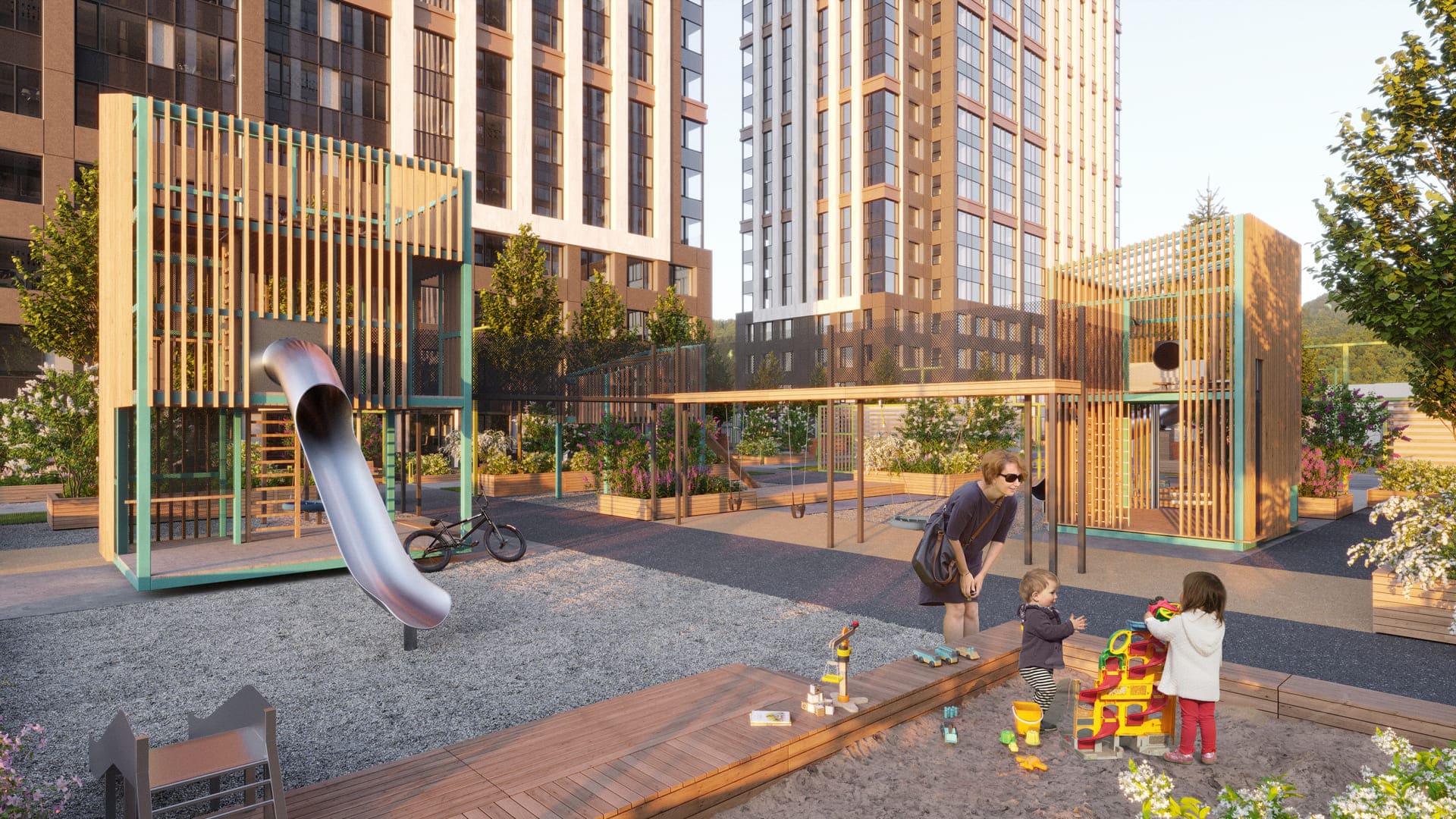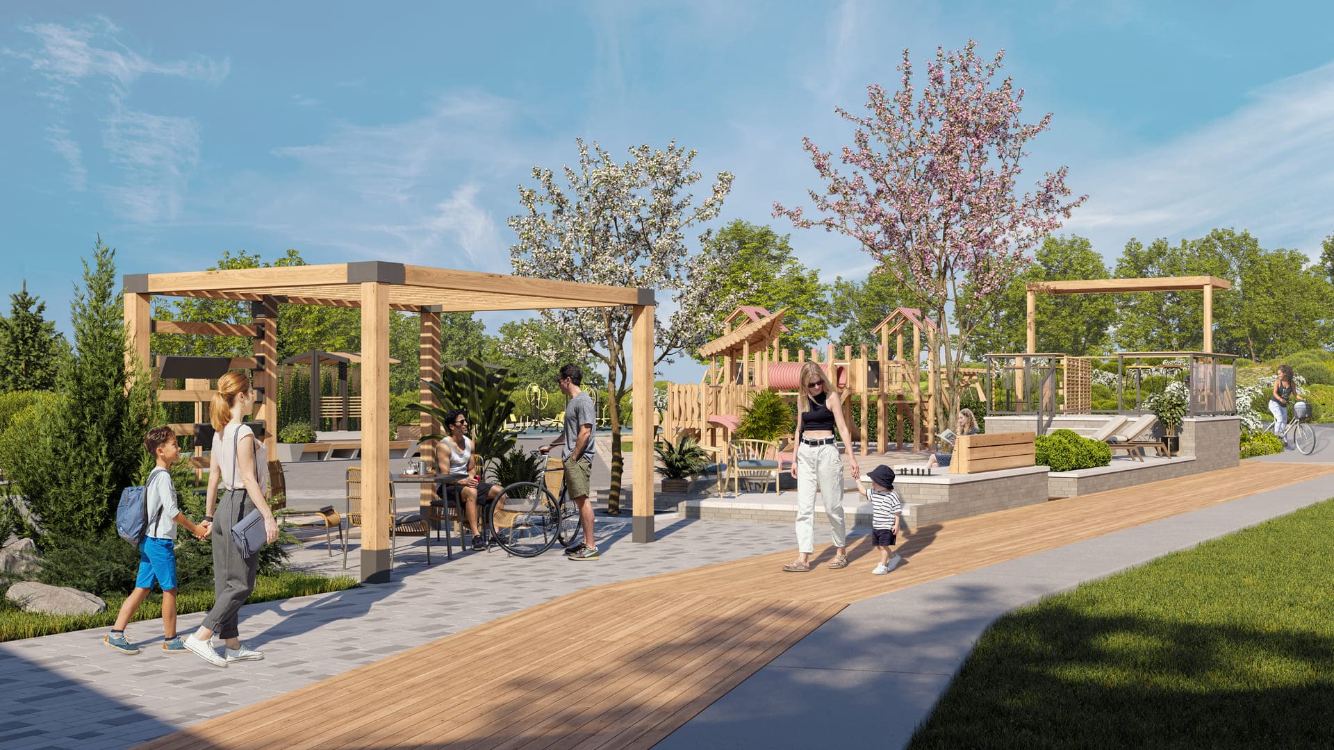 На территории жилого комплекса предусмотрены большой детский игровой городок, аллея для прогулок, площадки для пикников и зоны отдыха, спортивные и воркаут-площадки, а также зоны выгула собак и круговая беговая дорожка.