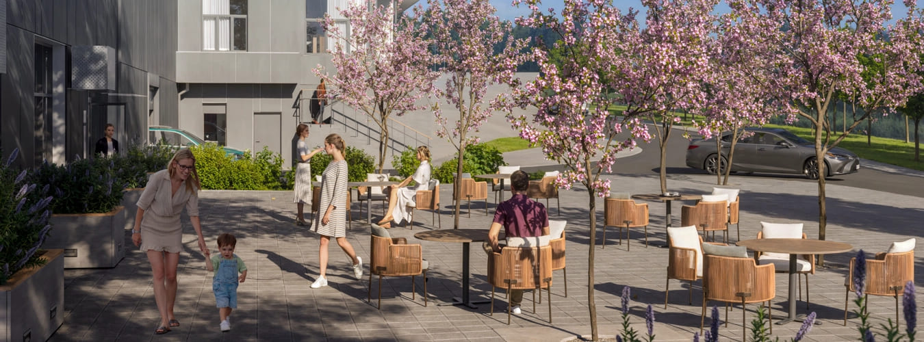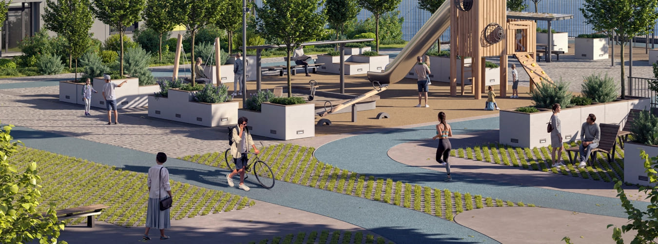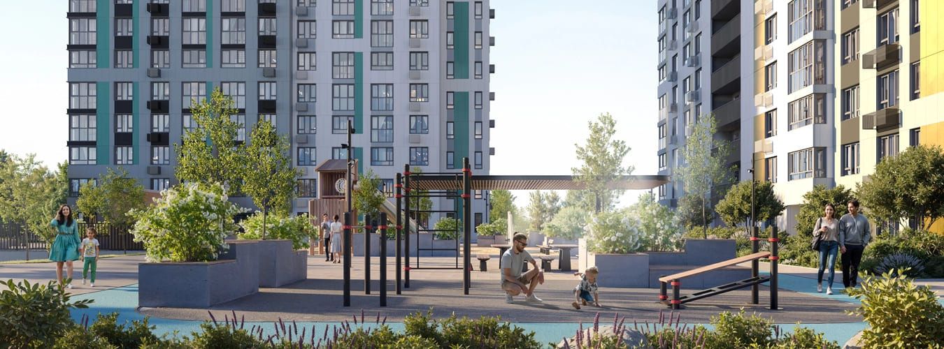 Двор без машин площадью 21 000 м² предлагает множество вариантов для досуга жильцов. Элементы благоустройства с безопасное резиновым покрытием гармонично распределены по всей территории.