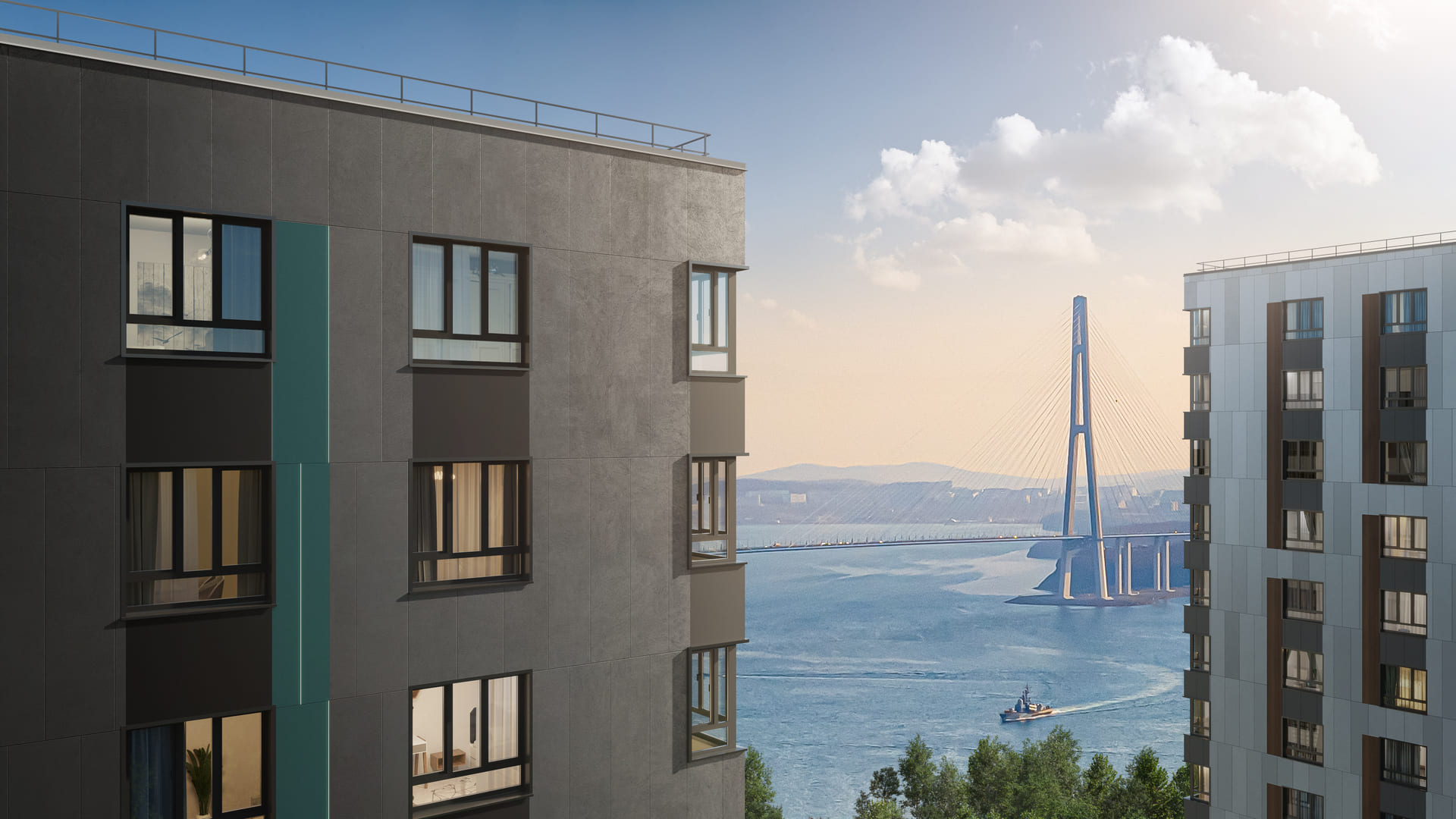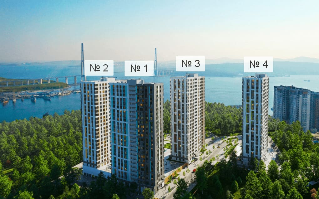 Жилые корпуса спроектированы таким образом, чтобы максимальное количество квартир имело вид на акваторию. С этажей комплекса открываются панорамные виды на пролив Босфор-Восточный, остров Русский и полуостров Эгершельд.