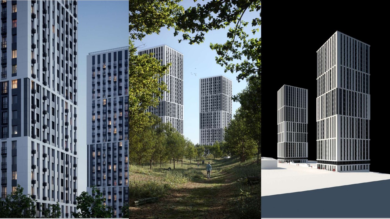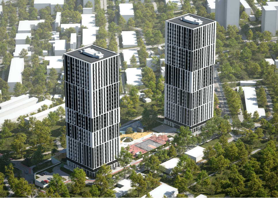 Проектом предусмотрен навесной вентилируемый фасад с облицовкой высокотехнологичными композитными панелями, которые уберегают стены от намокания и придают жилому комплексу неповторимый архитектурный стиль.