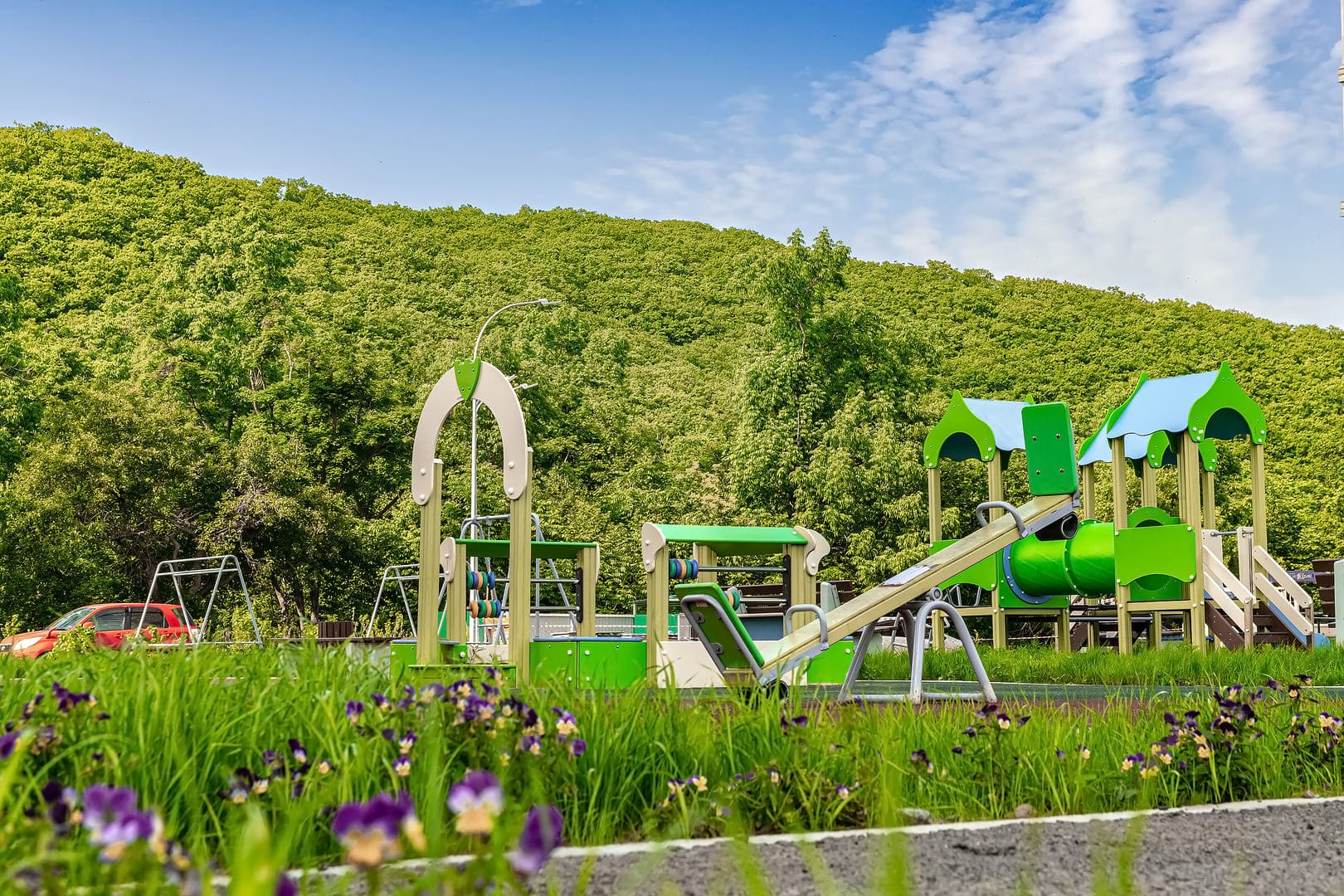 Детская площадка с оборудованием для игр на свежем аоздухе.