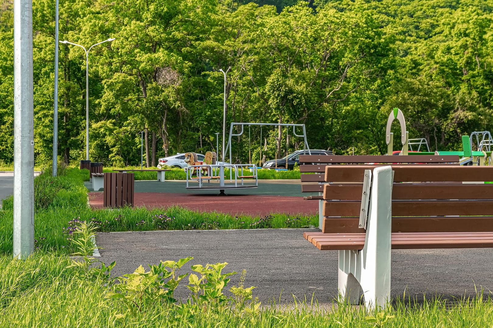 Места для отдыха оснащены удобными скамейками.