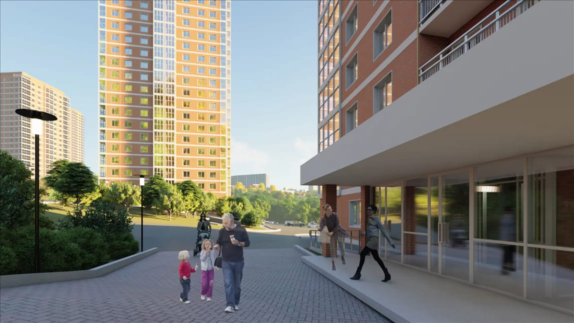 Проектом предусмотрен навесной вентилируемый фасад с облицовочным кирпичем и панорамным остеклением лоджий.