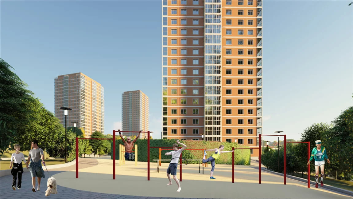 Зона воркаут, оснащенная тренажерами для силовых нагрузок и турниками для гимнастических упражнений.