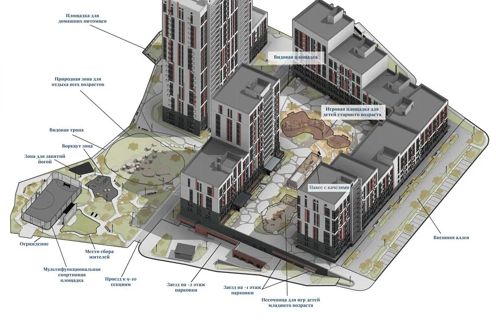 В «Амурском» благоустройство можно разделить на 5 зон, которые находятся как внутри комплекса, так и снаружи.