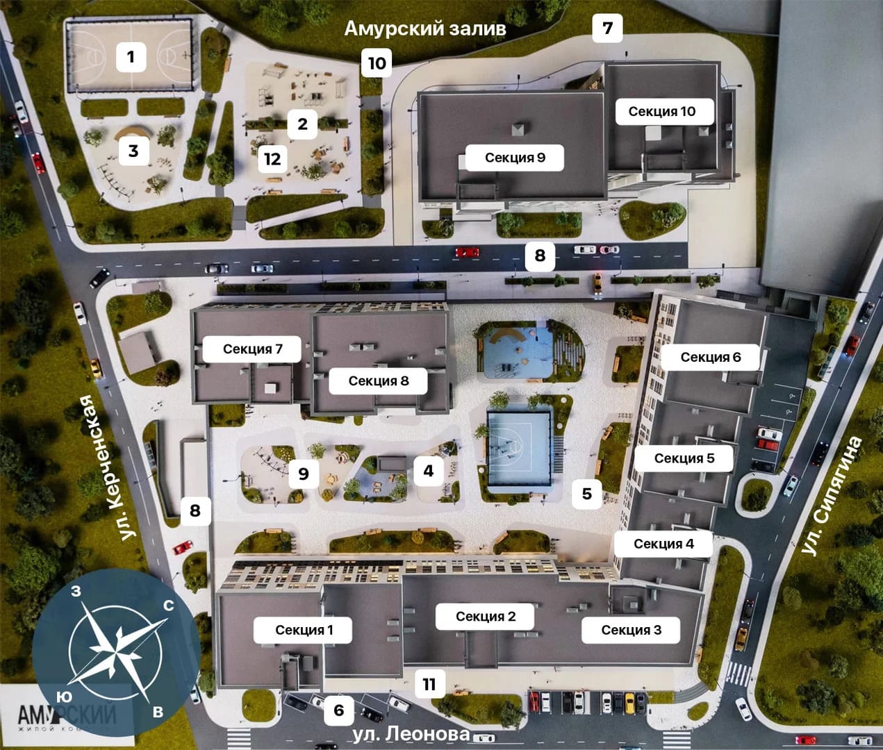 «Амурский» - жилой комплекс Комфорт класса на берегу Амурского залива в районе Эгершельд состоит из трех корпусов, включающий в себя 10 секций переменной этажности, собственного паркинга в стилобатной части и комфортабельных общественных пространств.