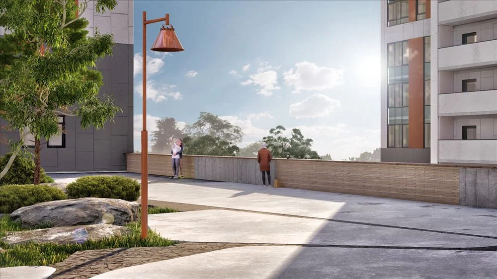 Коммерческие помещения, услугами и сервисами которых смогут пользоваться все жители района, расположены с внешней стороны жилого комплекса напротив секций 1-3. Здесь создана зеленная аллея, примыкающая к коммерции первых этажей, расположены столики для встреч и летнего общения со стаканчиком кофе.