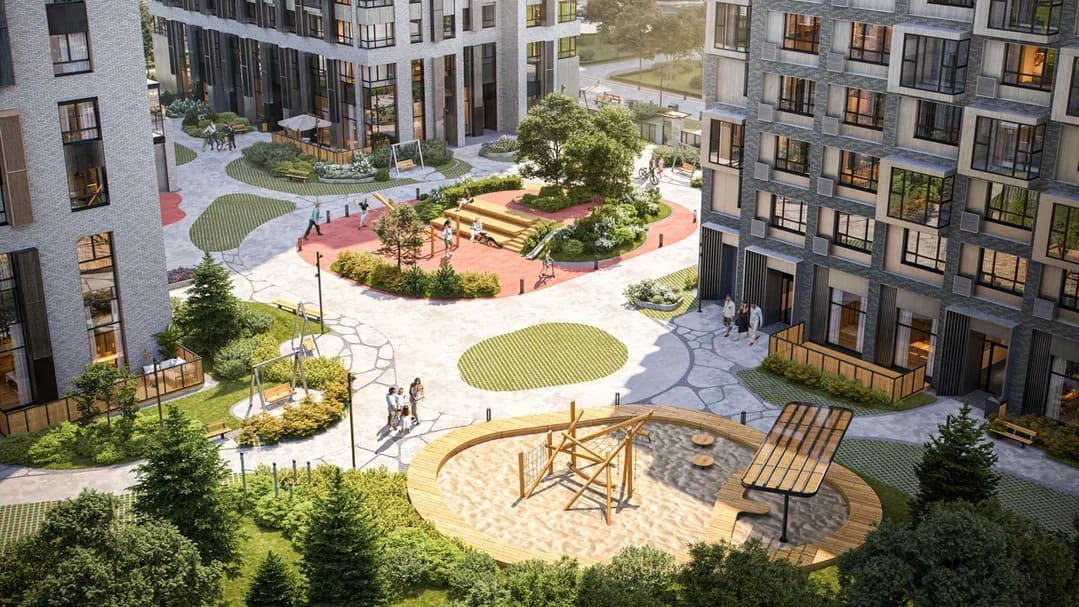 Детские площадки с современнным игровым оборудованием для детей разных возрастов и местами отдыха для родителей.