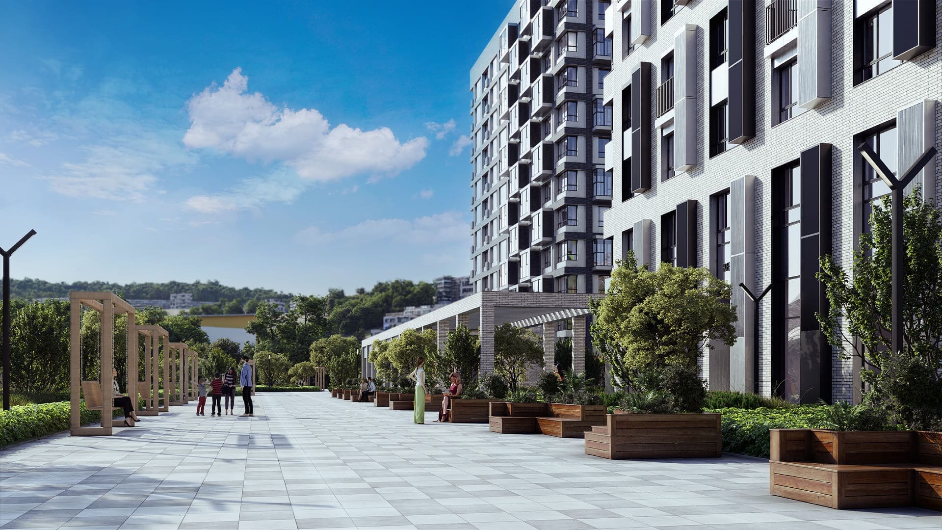 Пешеходный бульвар с элегантными качелями и местами для отдыха, где можно приятно провести время. прогуливаясь и беседуя с родными и друзьями.