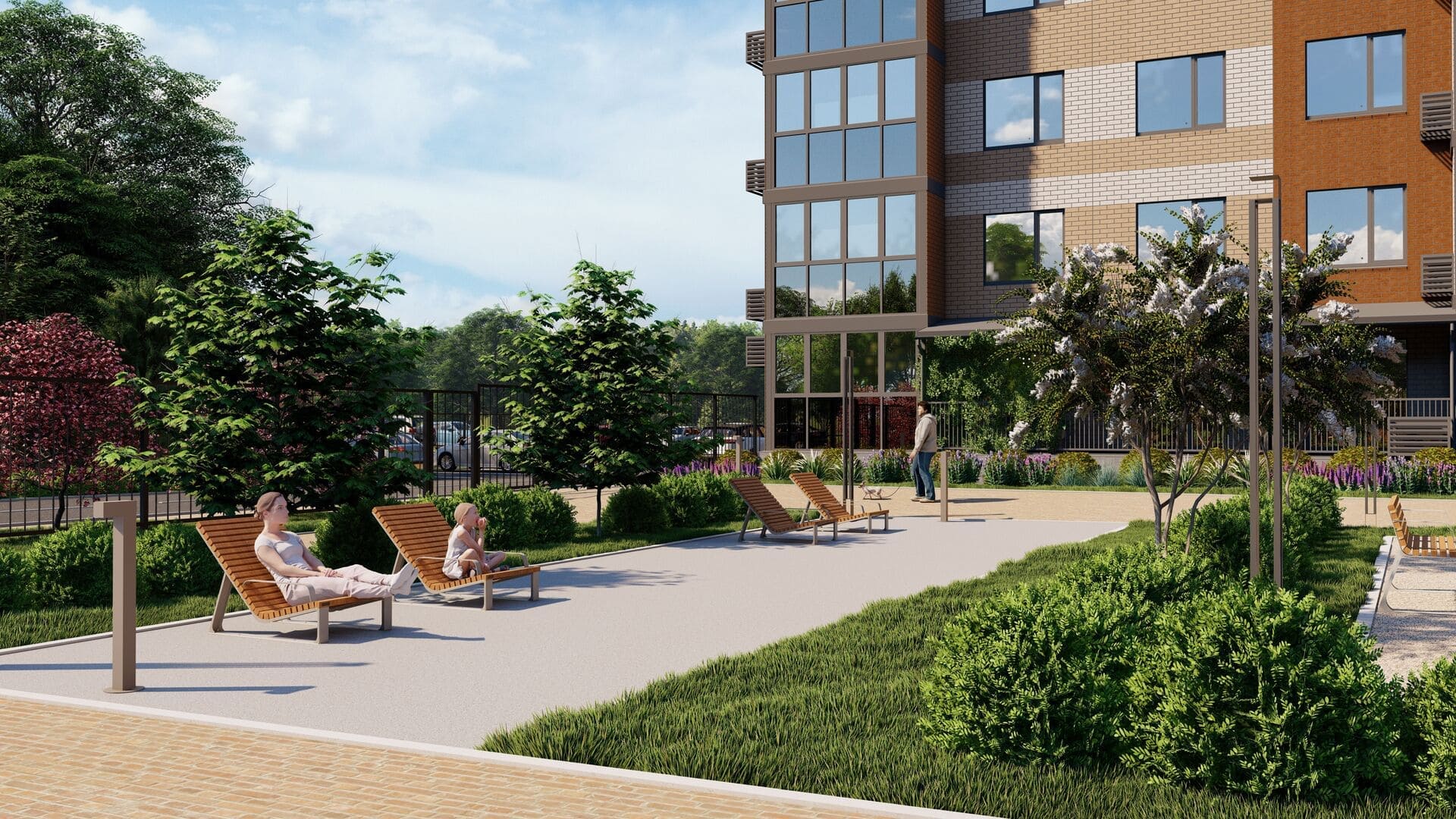 Зоны отдыха, гармонично распределенные по территории двора, оборудованы скамейками с навесами от солнца, шезлонгами и уличной мебелью для настольных игр.