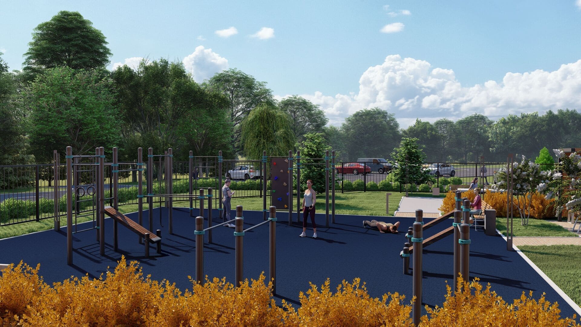 - Зоны воркаут, оснащенные скалодромами и турниками для гимнастических упражнений.