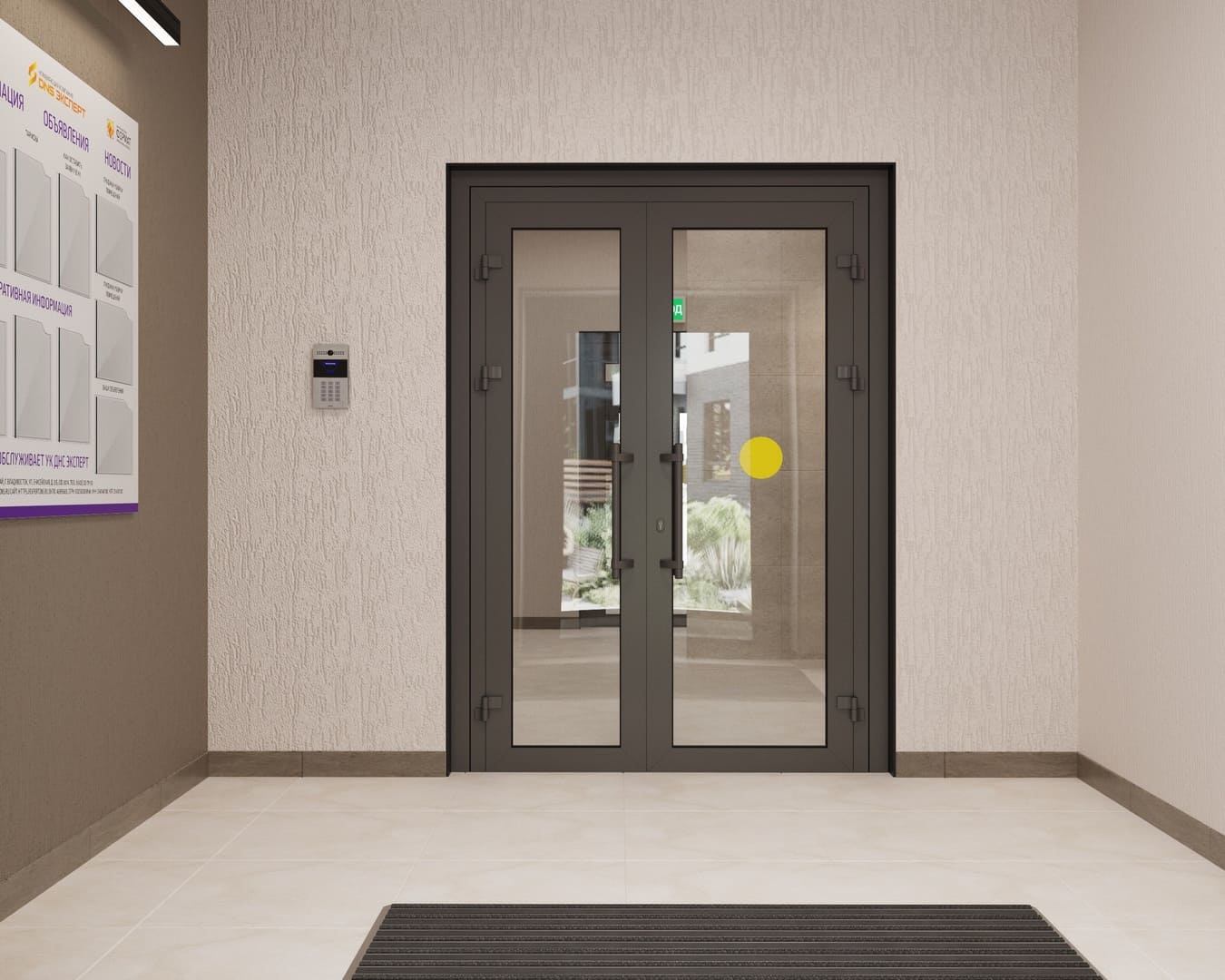 Безбарьерный вход в подъезд на уровне земли, теплый тамбур и витражное остекление входных групп.