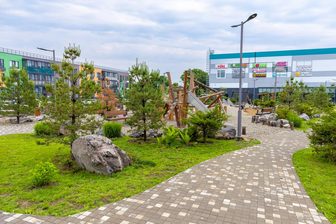 - Торговый комплекс и уютный сквер для отдыха и прогулок.