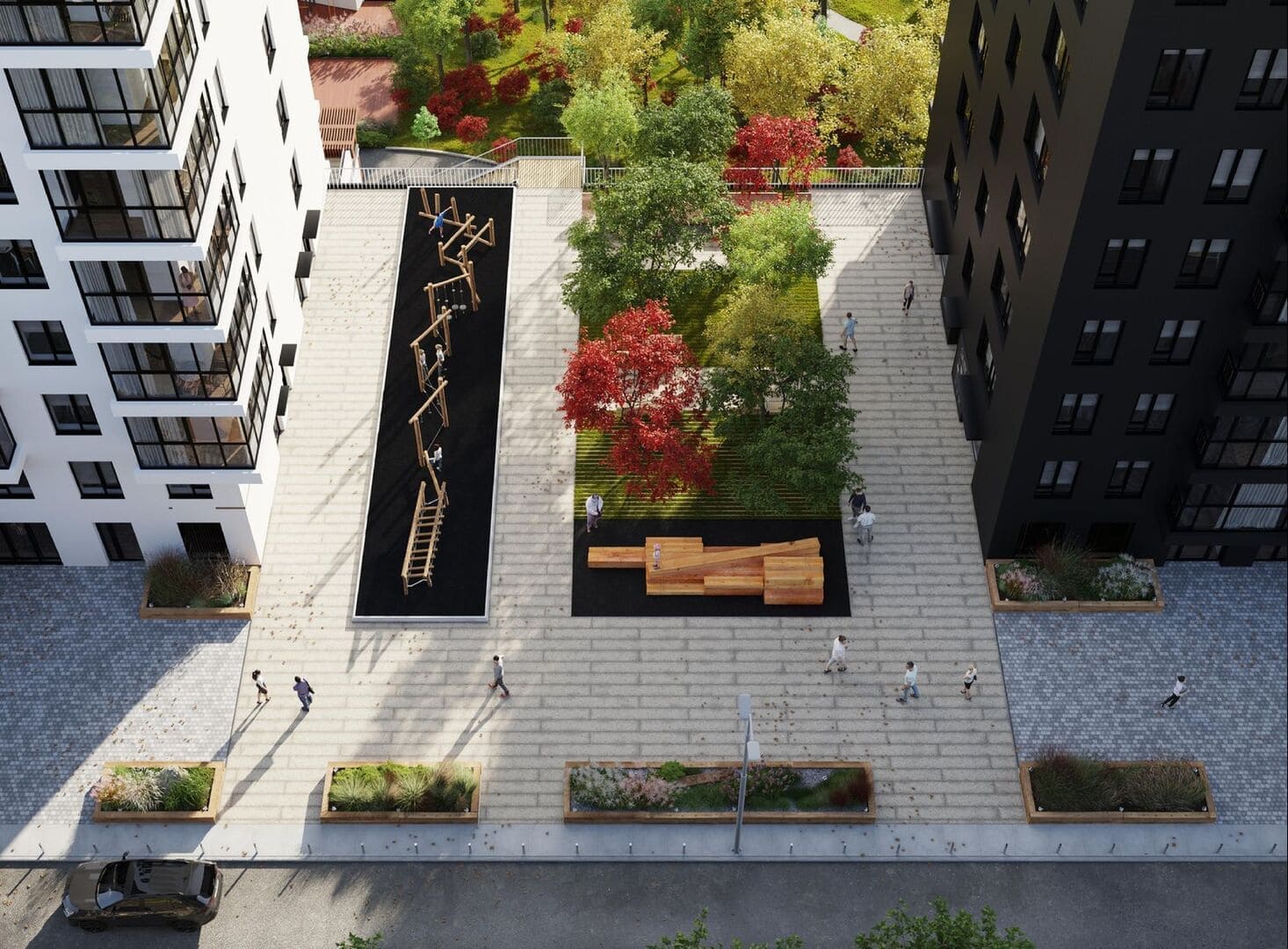 Двор без машин представляет собой единое пространство для отдыха с детскими и спортивными площадками, зелёным сквером с элементами ландшафтного дизайна.