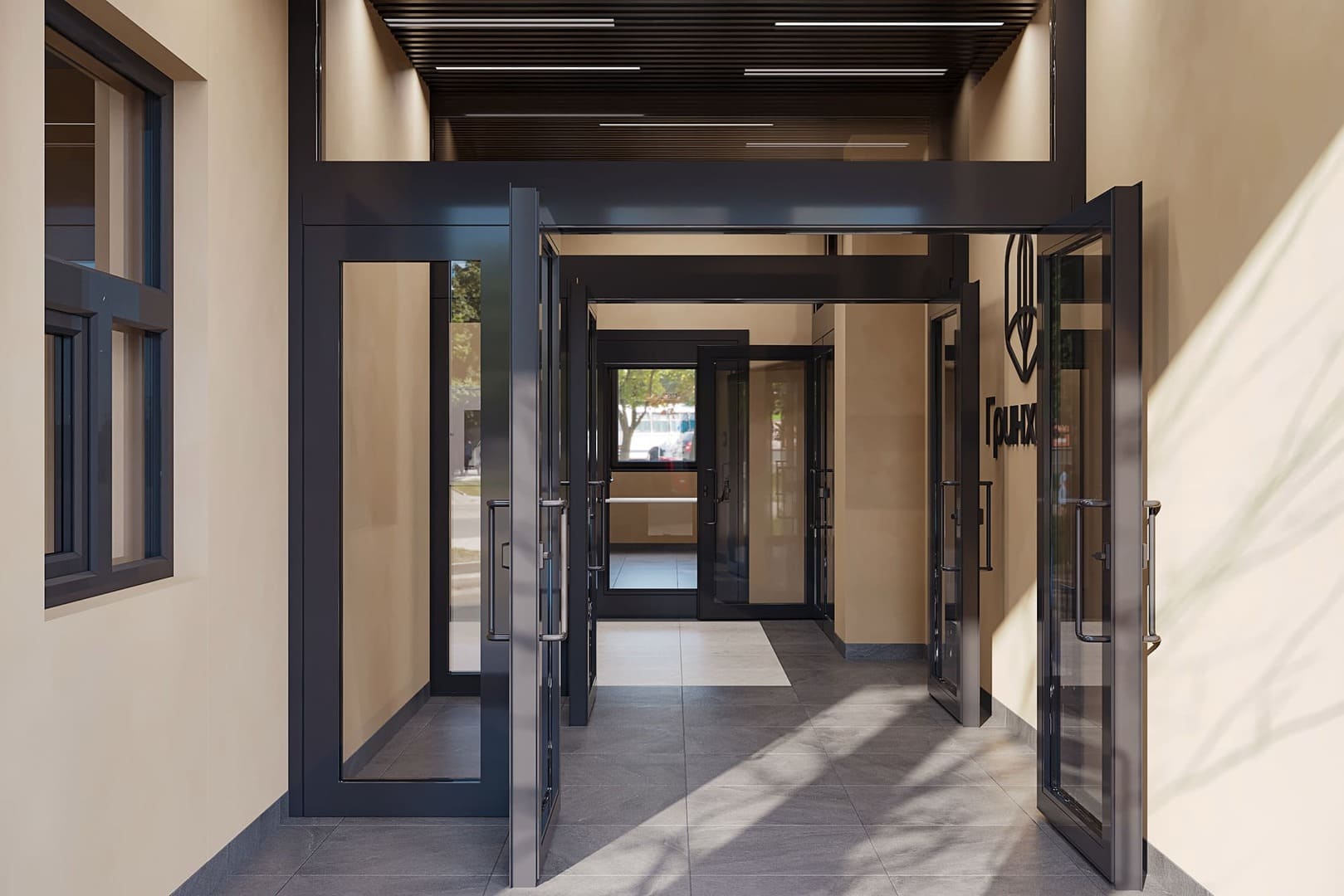 Безбарьерный вход с уровня земли, теплый тамбур. Предусмотрен сквозной проход на 1-этажах.