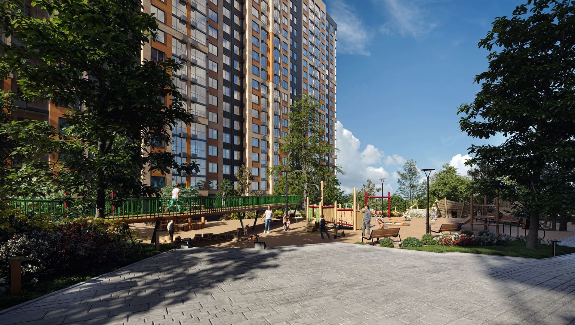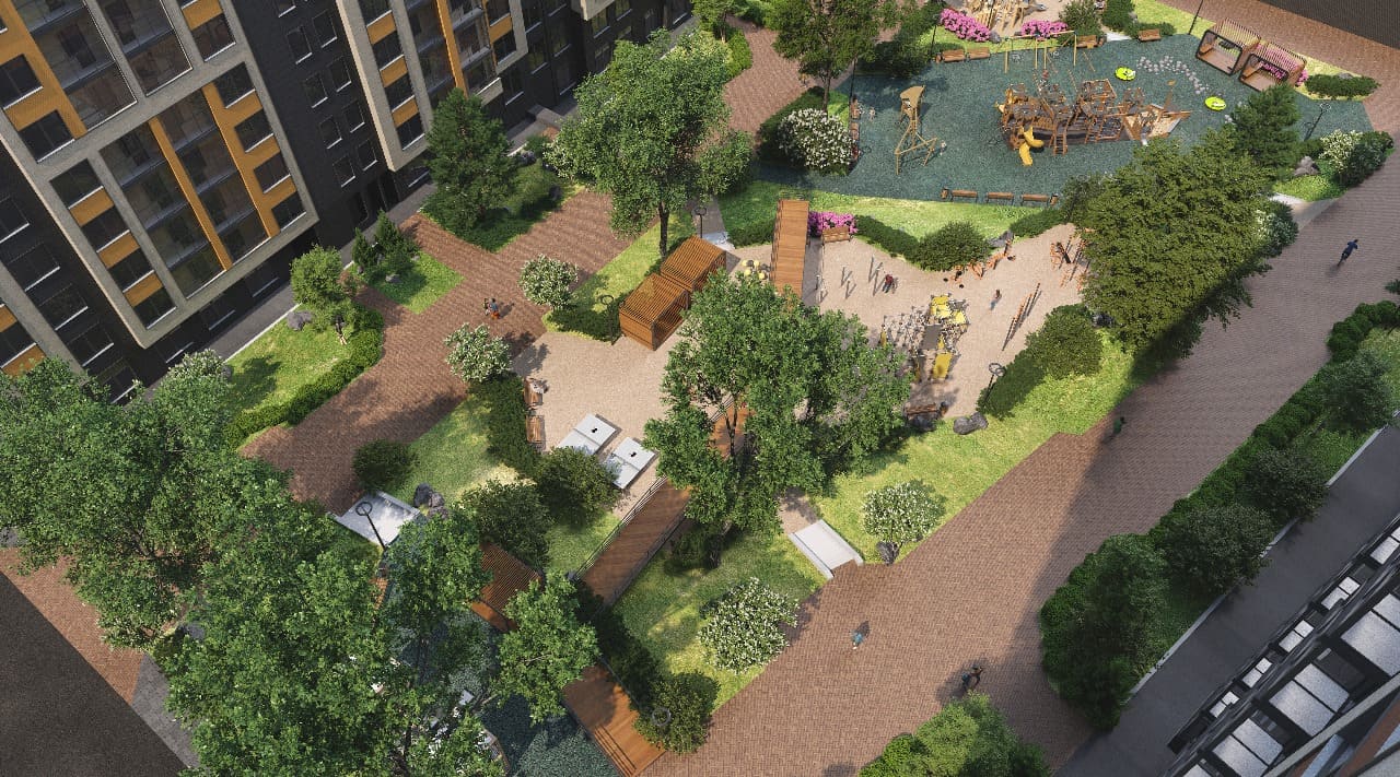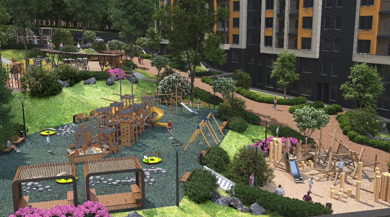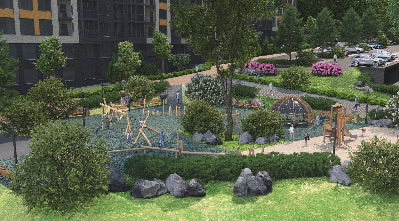 Большой двор-парк, с площадью благоустройства 4 000 м², реализован по концепции «двор без машин». Сеть пешеходных тропинок и проездов выполнена в плавных комфортных формах, что превращает любое передвижение по двору в приятную прогулку. Зоны отдыха и развлечений разделены по возрастным категориям.