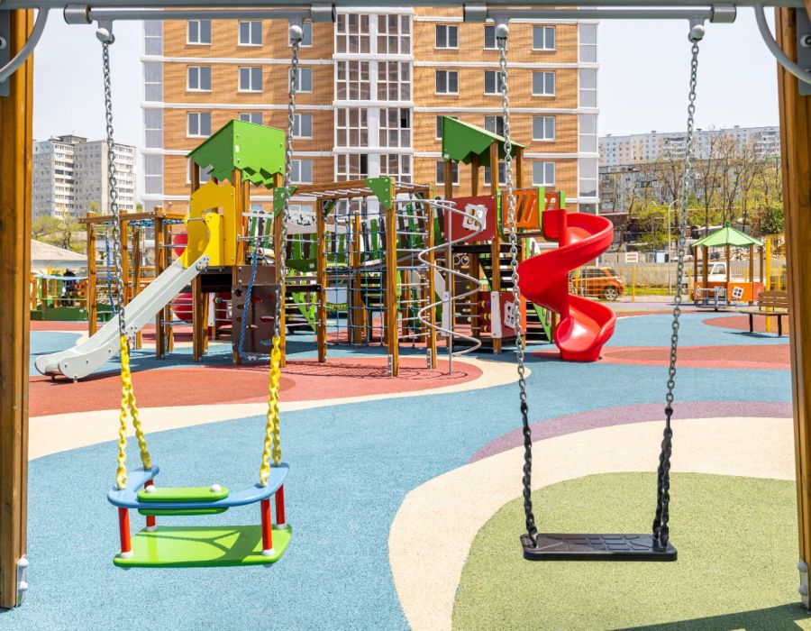 Детские площадки с местами для отдыха взрослых оснащены современным оборудованием: песочницы, горки, качели, небольшие домики, машинки, сетки для лазания и прочие конструкции.