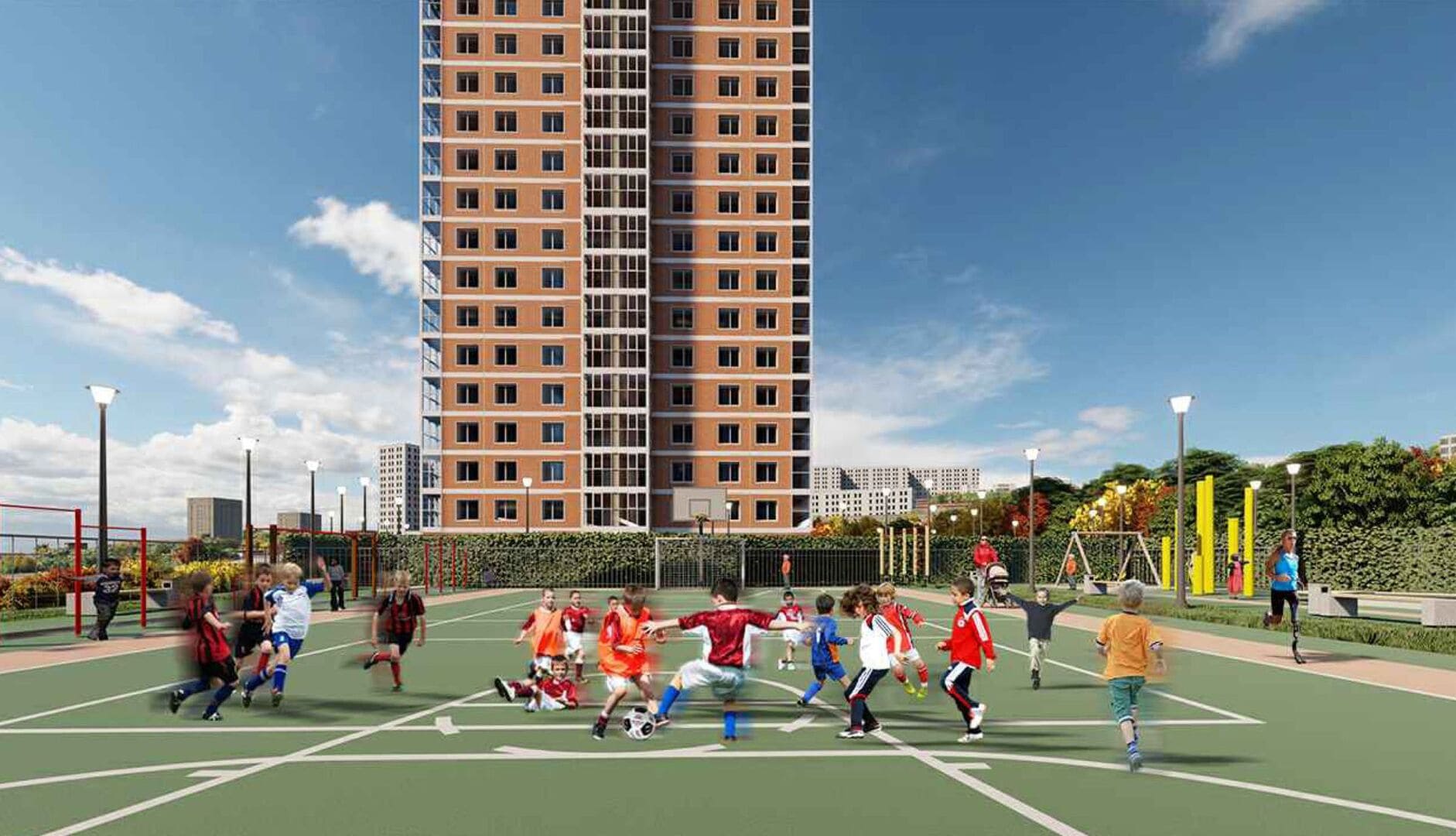 Детская и спортивная площадки расположены на кровле стилобатной части комплекса и оснащены безопасным резиновым покрытием и местами для отдыха взрослых.