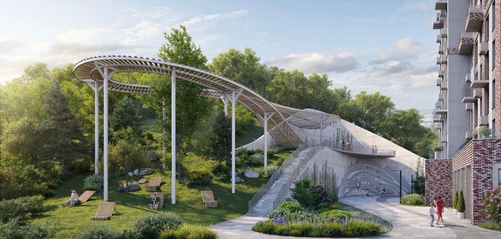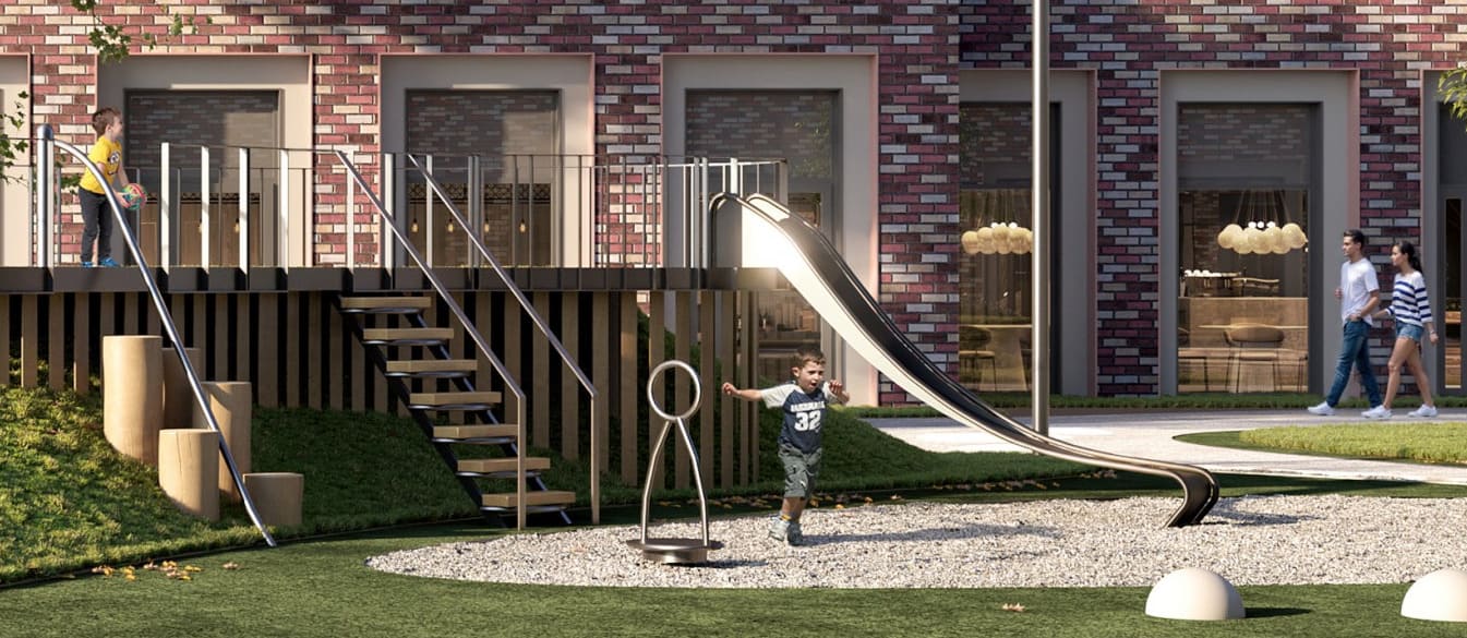 Детские площадки с современнным игровым оборудованием для детей разных возрастов и местами отдыха для родителей.