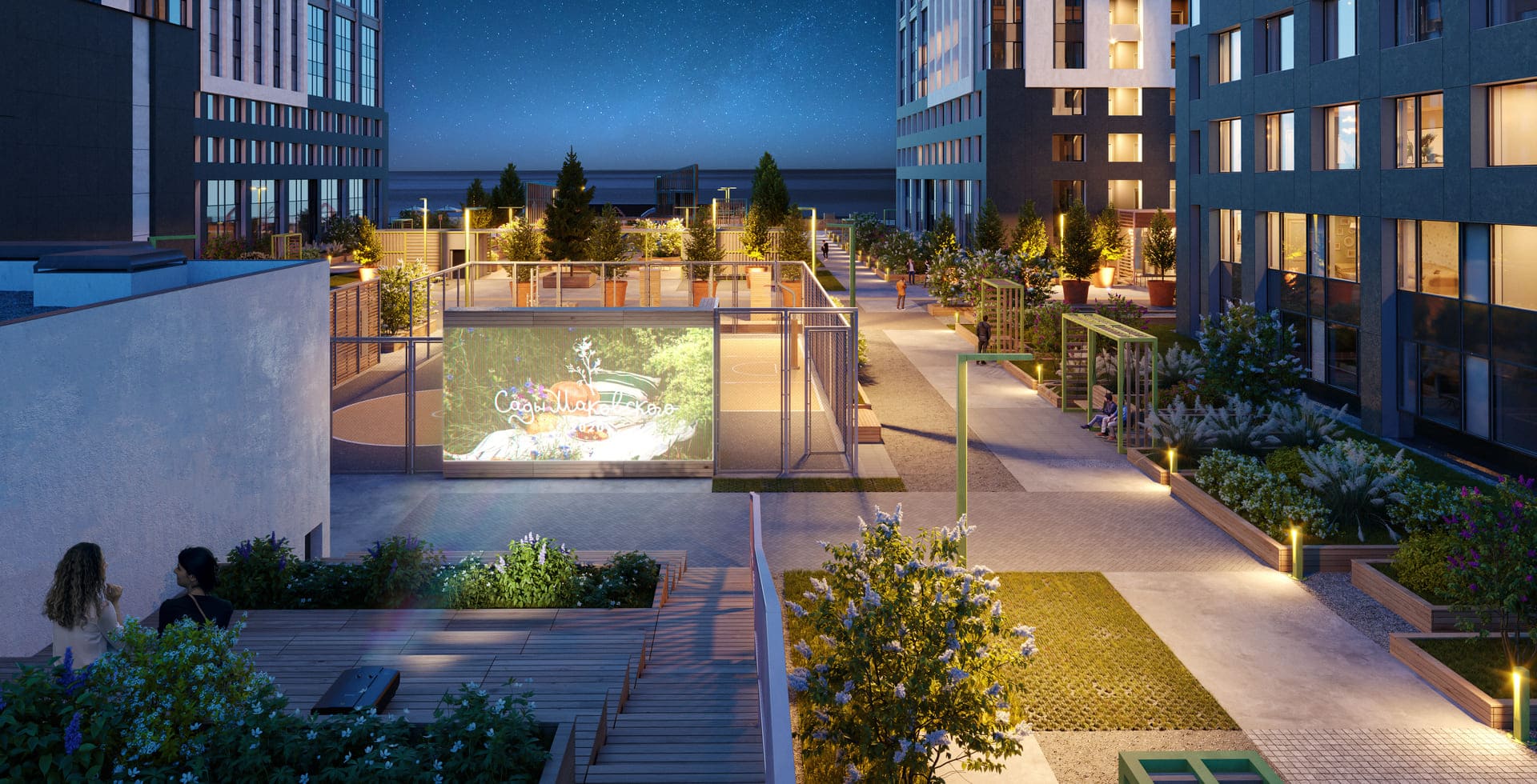 Продуманное до мелочей благоуствойство от Concrete Jungle создаёт ощущение жизни на природе, а так же предлагает множество вариантов для досуга внутри комплекса. В озеленении территории будут использоваться многочисленные виды деревьев, кустарников и большое количество клумб.