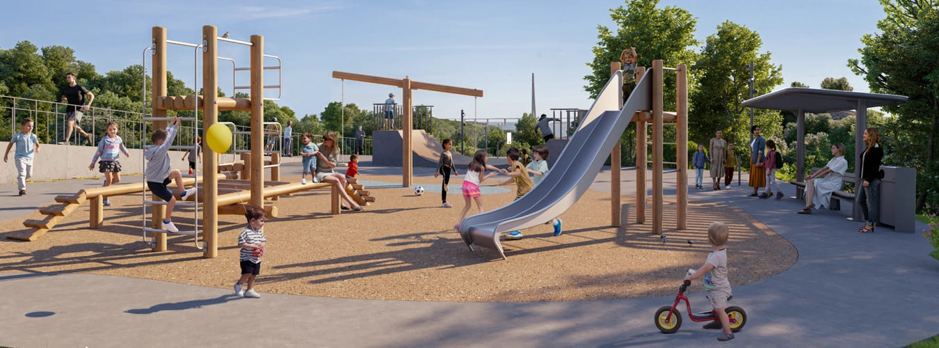 Детский игровой городок, спроектированный совместно с детскими психологами и состоящий из двух секторов, предоставляет возможность детям разных возрастов общаться и обмениваться опытом, а родителям отдохнуть в уютных беседках с навесами от солнца.
