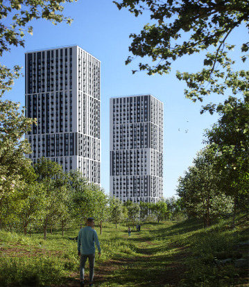 Проектом предусмотрен навесной вентилируемый фасад с облицовкой высокотехнологичными композитными панелями, которые уберегают стены от намокания и придают жилому комплексу неповторимый архитектурный стиль.