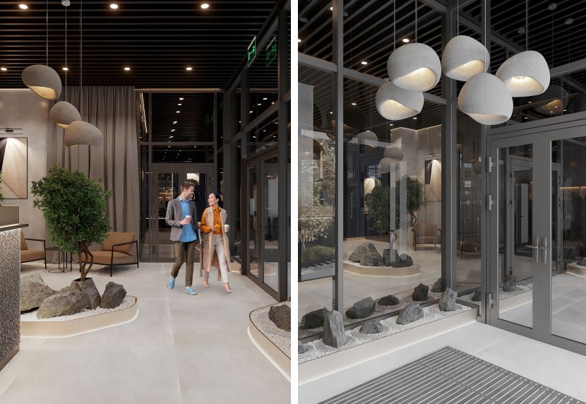 Входные группы с безбарьерным входом, теплым тамбуром и витражным остеклением.