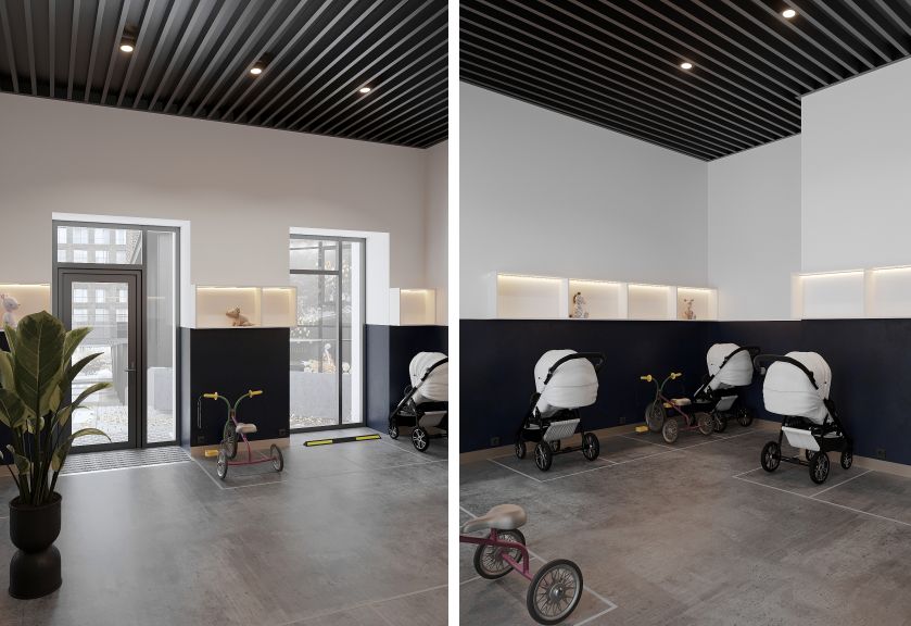 Кладовые помещения находятся на обоих уровнях паркинга и расположены вокруг лифтовых холлов, для удобства транспортировки вещей как в квартиру, так и до автомобилей.
