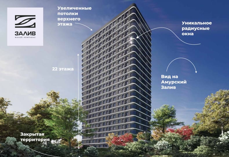 Футуристический жилой комплекс «Залив» расположен на первой береговой линии Амурского залива и представляет собой 22-этажный дом на 210 квартир с закрытой территорией, 2-уровневым подземным паркингом и широким выбором планировочных решений smart-vision.