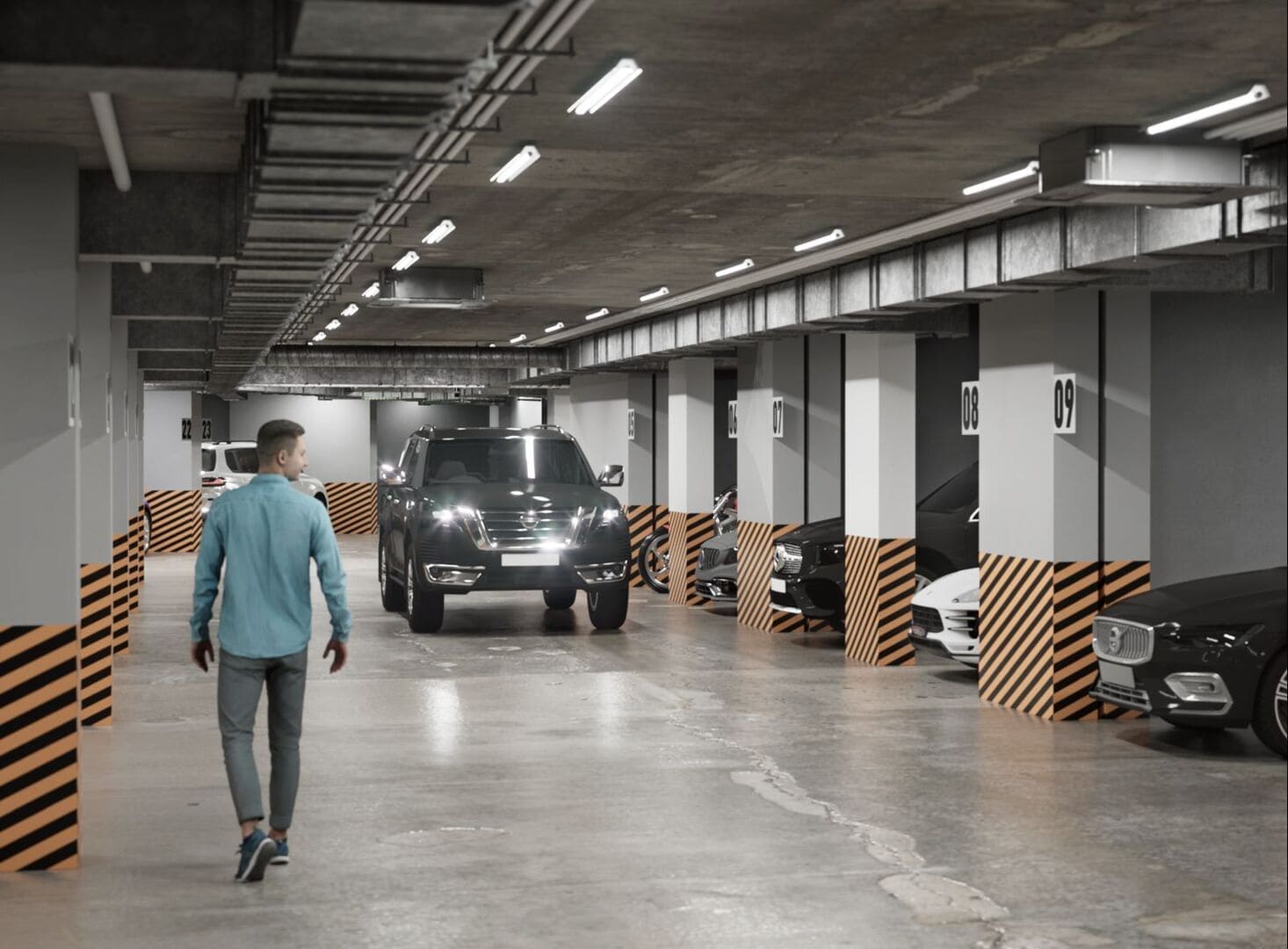 2-уровневый подземный паркинг на 97 машино-мест, 4 из которых с отдельными электрическими зарядными устройствами для автомобилей, оборудован пожарной и охранной сигнальными системами, контролем доступа, освещением и противопожарной вентиляцией.